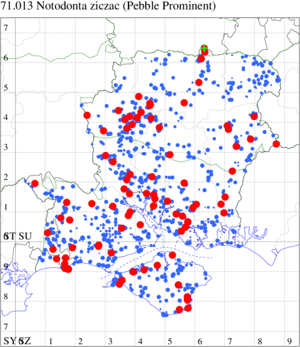 Local in broad-leaved woodland, scrub, hedgerows and gardens throughout much of south-eastern England. A moth with a curious distribution in our area, completely absent from the New Forest and the Isle of Wight but thinly distributed from the south-east of Hampshire up to the north and north-east. Wingspan 37-46 mm. The most likely confusion species is Coxcomb Prominent P. capucina, which see for differences. Larva feeds on Field Maple, mainly on young trees, over-wintering as a pupa.