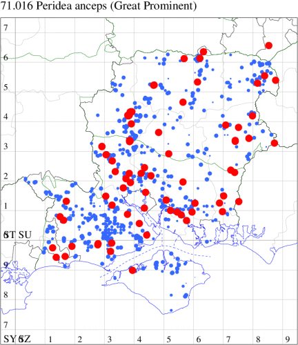 Common in woodland, scrub, parks and gardens throughout the British Isles. In Hampshire and on the Isle of Wight locally common, mainly in the south west. Wingspan 40-50 mm. The main confusion species is Maple Prominent P. cucullina, which is smaller, paler and has a white subterminal line and white subterminal fascia (MBGBI Vol 9). Larva feeds on various broad-leaved trees, including Birch, Hazel, Alder, Aspen, Sallow, Hawthorn, Lime, Oak, Beech and Rowan, over-wintering as a pupa.