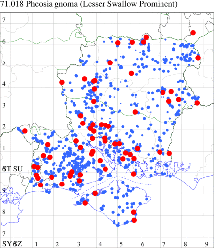 Local in broad-leaved woodland, hedgerows and gardens throughout England and Wales. Locally common in oak woodland in Hampshire and on the Isle of Wight, but especially in the New Forest. Wingspan 52-72 mm. Could be confused with the very rare immigrant Large Dark Prominent Notodonta torva, which see. Larva feeds on Pedunculate and Sessile Oak, over-wintering as a pupa.