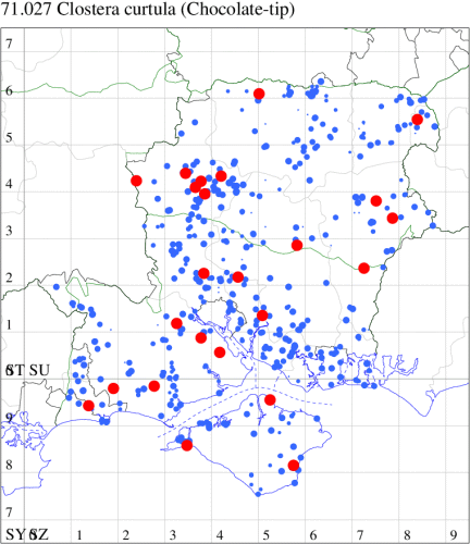 For the maps, all records prior to 2024 are shown by a blue dot (the larger the dot, the more recent), with the current year's records shown in red. As previous records are superimposed on any report for 2024, new sites have greater emphasis (i.e. will show as 'more red').