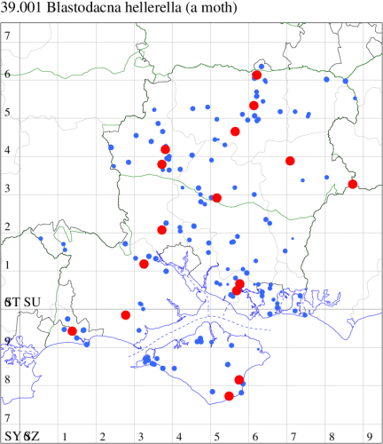 For the maps, all records prior to 2024 are shown by a blue dot (the larger the dot, the more recent), with the current year's records shown in red. As previous records are superimposed on any report for 2024, new sites have greater emphasis (i.e. will show as 'more red').