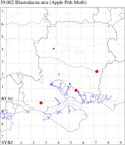 Common in hedgerows, woodland edges and scrub throughout the British Isles, but not in northern Scotland, and rare in Ireland. Recorded locally in Hampshire and on the Isle of Wight, but probably under-recorded. Wingspan 10-11 mm. The species differs from Apple Pith Moth B. atra by its pure white markings on the forewing and the absence of yellow-ochreous scales at the base of the dorsum. Larva feeds within berries of Hawthorn, over-wintering as a pupa.