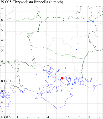 Nationally scarce (Nb) in lime woodland, parkland, urban areas and on roadside verges in parts of southern England and southern Wales, with records north to Yorkshire. In Hampshire recorded on the coast at Bournemouth, Christchurch, Southampton and Southsea, where regular and frequent, but recorded infrequently further inland. Not recorded from the Isle of Wight to date. Wingspan 10-13 mm. Differs from C. lathamella in the forewing, which has the orange ground colour undivided, by the narrow dark edging of the basal part of the costa and by the lack of a patch of erect dark scales in the second dorsal spot (MBGBI Vol 4 part 1). Larva feeds within bark of Common Lime, Small-leaved Lime and Large-leaved Lime.