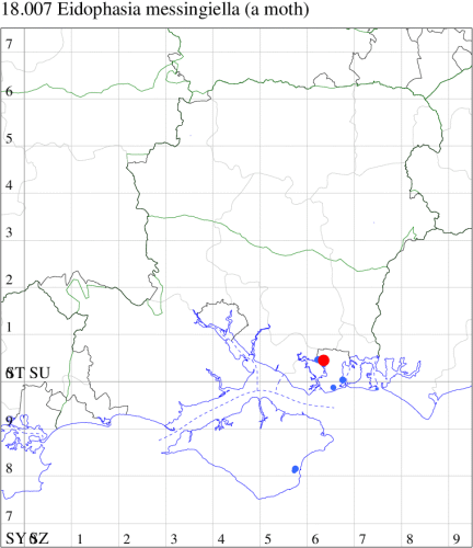 Local on waste ground throughout much of southern England and Wales, north to Lancashire. In Hampshire, recorded very frequently on an annual basis in the Portsmouth area, with a few localised records from the 1990s in the north of the county. First recorded from the Isle of Wight in 2014 at Shanklin, where it has occurred again in recent years. Wingspan 14-16 mm. Bold cream stripe across centre of forewing and two pale rings on tip of dark antennae are characteristic of this fairly distinctive species. Larva feeds on Hoary Cress.