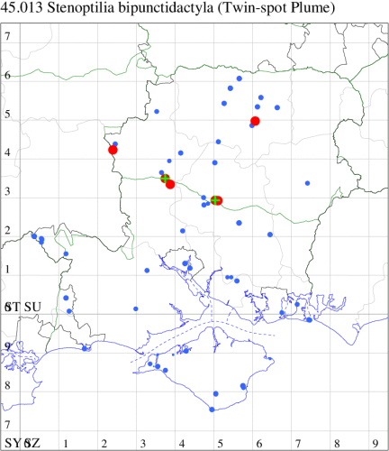 For the maps, all records prior to 2024 are shown by a blue dot (the larger the dot, the more recent), with the current year's records shown in red. As previous records are superimposed on any report for 2024, new sites have greater emphasis (i.e. will show as 'more red').