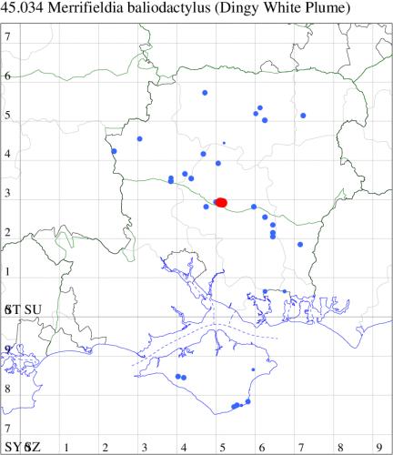Nationally scarce (Nb) on chalk downland and waste ground, mainly in the southern counties of England. In Hampshire restricted to the few areas of unimproved grassland at sites such as Oxenbourne, Stockbridge and Magdalen Hill Down. Recently recorded on the Isle of Wight for the first time since 1981. Wingspan 20-27 mm. Very similar to several other species of plume moth, from which separable only by dissection of the genitalia. Larva feeds on stems of Wild Marjoram.