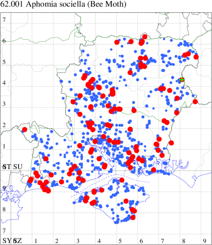 For the maps, all records prior to 2024 are shown by a blue dot (the larger the dot, the more recent), with the current year's records shown in red. As previous records are superimposed on any report for 2024, new sites have greater emphasis (i.e. will show as 'more red').