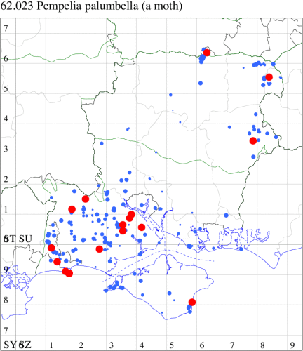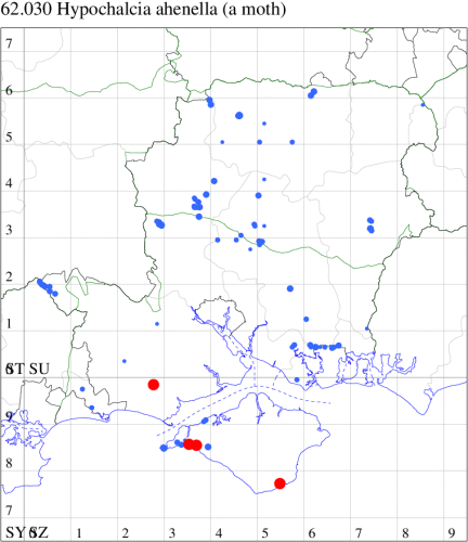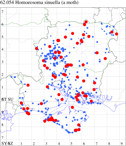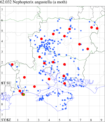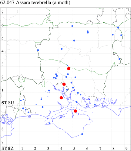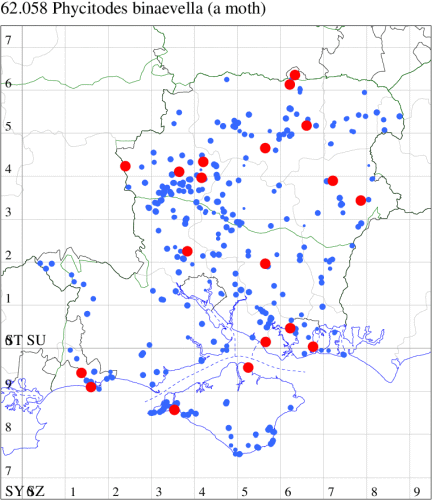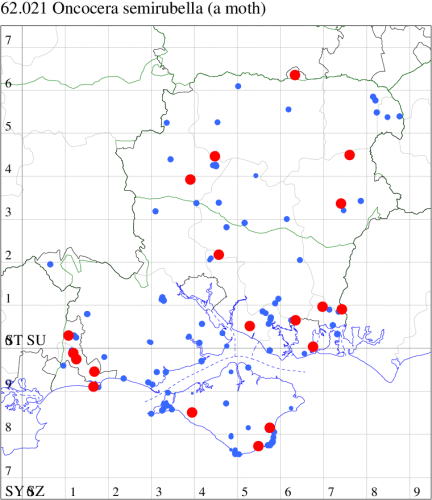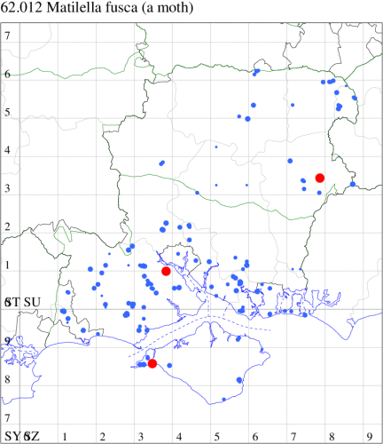 VC11: Brockwood, one, 19 Jul (SDut); Blashford Lakes HIWWT NR, one, 10 Aug (PWhtk); Brockenhurst, one, 03 Aug; one, 04 Aug (MWelf); Parc Pale, NF, present, at dusk, 18 Jul (AMD); Marchwood, one, 31 Jul (CTha); Woodlands, NF, one, 02 Aug (RBW); Romsey, one, 04 Aug (NRJ); Dibden Purlieu, NF, one, 11 Jul; present, 11 Jul; one, 16 Jul; Dibden Purlieu, two, 19 Jul; one, 14 Aug (RAC); Itchen Valley C.P., one, 19 Jul; Brownwich Cliffs, Titchfield, two, 26 Jul (F.M.G.); Portsmouth, one, 29 Jul (IRT); Waterlooville, one, 01 Aug (DWhe); Christchurch, one, 30 Jul (APard); Hengistbury Head NNR, one, 01 Aug; one, 06 Aug; two, 07 Aug (HengistH det. MJef); two, 11 Aug (MoTay det. MJef); Hengistbury Head, two, 30 Jul (MJef); Stanpit Marsh LNR, one, 13 Aug (PAB); Hengistbury Head, six, 18 Jul; one, 18 Jul; two, 26 Jun; two, 26 Jun (MJef); Sway, two, 30 Jul; one, 13 Aug (SKee); Browndown, one, 09 Aug (F.M.G.); Sinah Common, five, at dusk, 23 Jul (AMD);