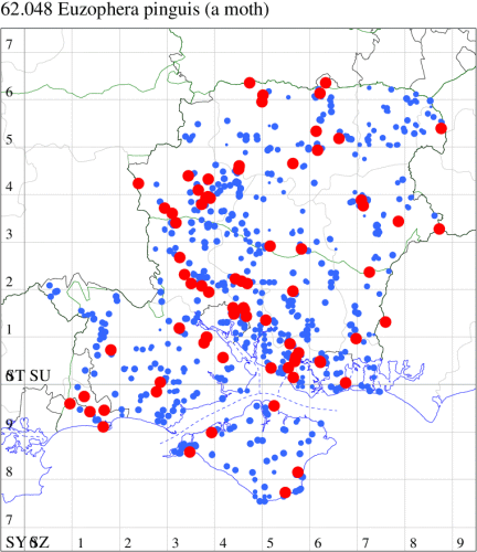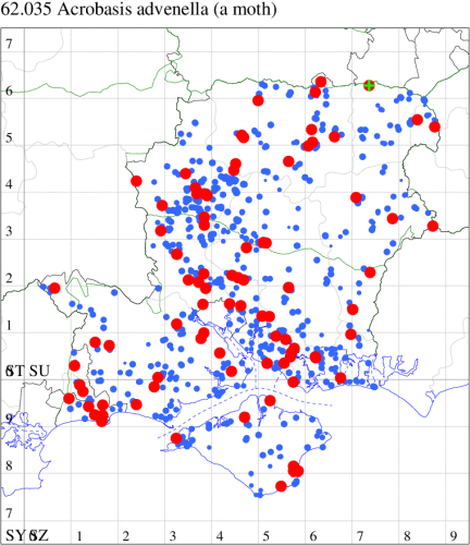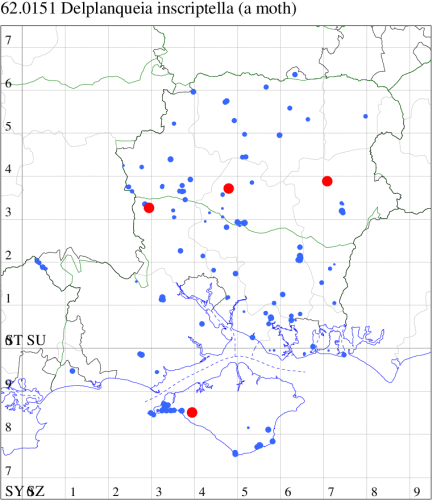 For the maps, all records prior to 2024 are shown by a blue dot (the larger the dot, the more recent), with the current year's records shown in red. As previous records are superimposed on any report for 2024, new sites have greater emphasis (i.e. will show as 'more red').