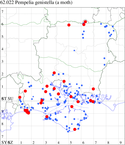 Nationally scarce (Nb) on heathland in southern England, from Sussex to Dorset, where predominantly coastal. In Hampshire and on the Isle of Wight almost exclusively recorded within a few miles of the coast, with a handful of records inland from the New Forest and the heaths in the north-east of the county. Wingspan 26-29 mm. Coloration more ochreous than in related species; black edging of cross-lines usually a prominent feature [Goater]. Larva feeds on Gorse, on which the larval webs are abundant in spring.