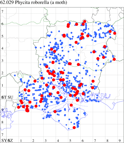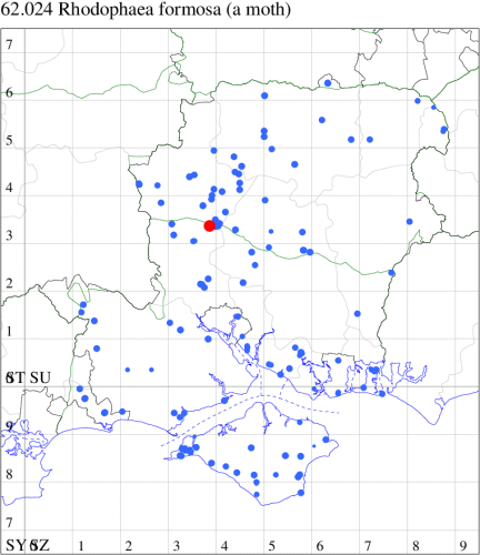 VC11: Brockenhurst, one, 04 Aug (MWelf); Marchwood, one, 31 Jul; one, 05 Aug; one, 18 Jun (CTha); Woodlands, NF, one, 26 May (RBW); Romsey, one, 14 May (NRJ); Swaythling, Southampton, one, 03 Jun (MEdg); Allbrook, one, 10 May (SIng); Stubbington, one, 25 Jun (DPH); Funtley, one, 30 Jul (TDC); Lee-on-Solent, one, 31 Aug (IHrg); Fareham, one, 07 May (ADT); Botley, one, 23 Jul (SLB); Portchester, one, 11 Aug (DH-J); Waterlooville, one, 12 May; three, 14 May; one, 17 May; one, 09 Jun; six, 11 Aug (DWhe); Merritown Heath, present, 17 Aug (DFoo); Hurn, one, 31 Jul (MJef); Christchurch: Cross Way, one, 14 May; one, 31 Jul; one, 04 Aug; one, 05 Aug (LPyk); Hengistbury Head, one, 30 Jul; three, 10 May; two, 27 Aug; one, 03 Jun; three, 10 May (MJef); Hengistbury Head NNR, larva, one, field obs., quercus, 27 Oct (JOug); Sway, one, 15 May (SKee); Pilley, NF, one, 11 May (MHay);