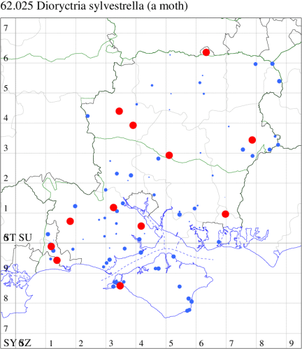 Nationally scarce (Nb) in pine woodland in south-eastern England. In Hampshire and on the Isle of Wight widespread, but thinly distributed throughout much of the county, remaining very uncommon on the Island. Resident population probably increased by migration from the continent, particularly in 2006. Wingspan 28-35 mm. The genus Dioryctria contains four closely related species in Britain, which require close examination to separate: in D. sylvestrella the subterminal line is generally smooth with a single waved kink its mid-point, in the other three species this line is dentate from the mid-point to the dorsum. Larva feeds on Scots Pine, Maritime Pine and Corsican Pine.