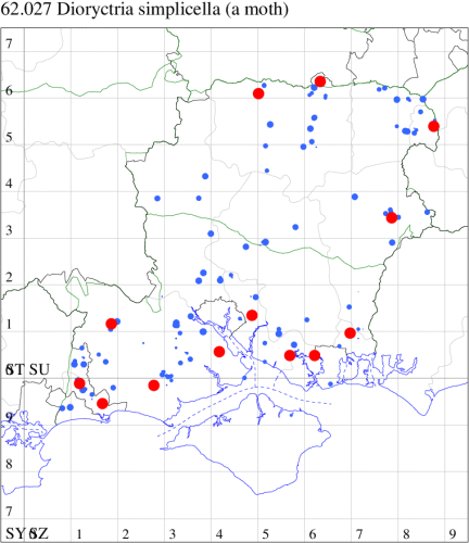Local in pine woodland throughout much of England and Scotland. In Hampshire and on the Isle of Wight common where there is pine on heaths and plantations throughout the county, but distinctly uncommon on the Island. Wingspan 24-30 mm. The genus Dioryctria contains four closely related species in Britain, which require close examination to separate: D. simplicella is usually more uniformly grey in appearance than the other three species, exhibiting a reduction in contrast between the ground colour of the forewing and the paler cross-lines and discal spot. Larva feeds within young shoots of Scots Pine, Corsican Pine and Maritime Pine.