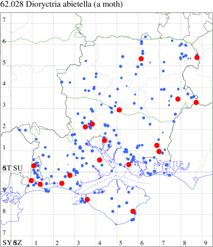 Common in pine woodland throughout southern England, also appearing as a migrant from mainland Europe away from the vicinity of pines. In Hampshire and on the Isle of Wight closely associated with Scots Pine, and fairly common in the county. Wingspan 27-33 mm. The genus Dioryctria contains four closely related species in Britain, which require close examination to separate: D. abietella is most likely to be confused with D. sylvestrella, which see for a description of the differences. Larva feeds within young shoots of Scots Pine, Norway Spruce and European Larch.