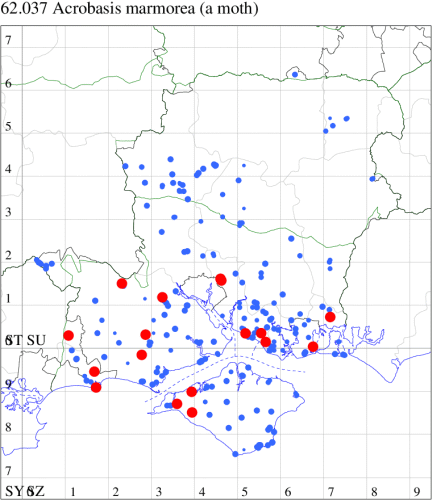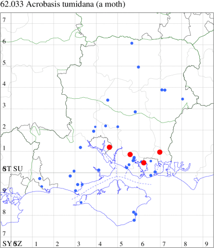 Nationally scarce (Na) in coniferous woodland and plantations throughout much of southern England. In Hampshire a rather elusive species in stands of Norway Spruce, mainly in the New Forest, which continues to be recorded annually in very small numbers; very rare on the Isle of Wight. Wingspan 22-25 mm. Larva feeds within cones of Norway Spruce, causing sufficient damage to be a serious pest in some areas.