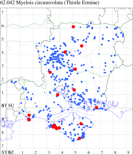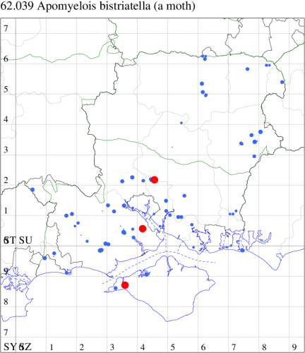Common in rough ground and meadows throughout England and Ireland. Widespread and fairly common in Hampshire and on the Isle of Wight. Wingspan 22-27 mm. This easiest of the Phycitodes to identify, more robust than its congeners and more strongly marked, with the three dots well-developed and characteristically placed [Goater]. Larva feeds within flowerheads of Thistle, Tansy and Mugwort.