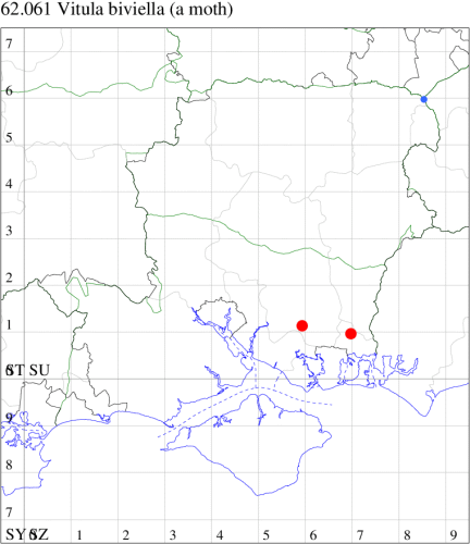 A rare migrant or adventive. First recorded from a garden in Lydd, Kent on 13 July 1997, with four at the same site on four dates between 5 and 26 July 1998, and nine in 1999. First recorded in Hampshire in 2022. Wingspan 12-18 mm. Similar to certain Ephestia species, but greyer and less variegated in appearance, while the twin discal spots on the forewing of V. biviella are more elongate and the whitish cross-lines are more distinct, straighter and contrasting [Goater]. Larva feeds on Scots Pine, living within a silken gallery amongst the young shoots and male plants.