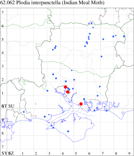 Local in barns, warehouses and granaries, also sometimes in and around houses, throughout the British Isles, rarely recorded in the wider countryside. Thoroughly naturalised, through accidental introduction in dried goods, and now a frequent, often abundant, pest of warehouses, first recorded in Britain in 1847. Distributed erratically across Hampshire and on the Isle of Wight, where often found in bird seed and similar products, from pet shops. Wingspan 14-20 mm. Larva feeds on dried goods, cereals, grain, dried fruit, nuts and dead insects, causing sufficient damage to be a serious pest in some areas.