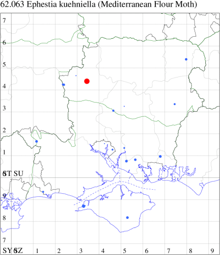 Naturalised through accidental introduction in dried goods in barns, warehouses, granaries and container ports throughout much of the British Isles. In Hampshire and on the Isle of Wight seldom recorded, but then seldom sought, inside flour mills and warehouses. Wingspan 20-25 mm. One of six very similar species of Ephestia found in the UK, which are generally separable only by dissection of the genitalia, most wild-caught individuals being E. unicolorella, with the other five species favouring warehouses. The largest Ephestia species, forewing darker grey than in the other species, discal dots more conspicuous and second line characteristically deeply indented near costa [Goater]. Larva feeds on wheat-flour, dried fruit, nuts, dried goods, cereals and grain, causing sufficient damage to be a serious pest in some areas.