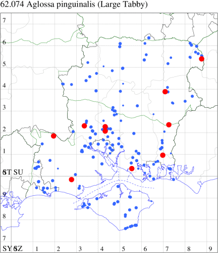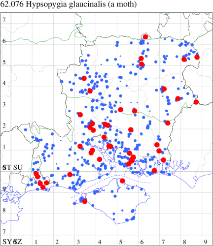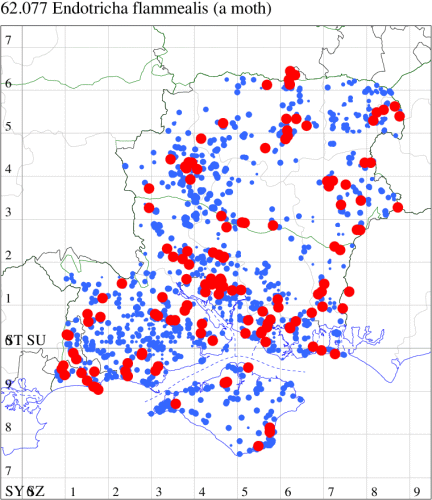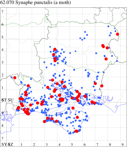 For the maps, all records prior to 2024 are shown by a blue dot (the larger the dot, the more recent), with the current year's records shown in red. As previous records are superimposed on any report for 2024, new sites have greater emphasis (i.e. will show as 'more red').