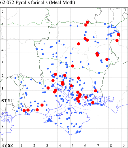 Common in farm buildings, barns, warehouses and granaries, also sometimes in houses, across much of Britain, occasionally recorded in the wider countryside. Distributed widely and evenly over Hampshire and on the Isle of Wight, with no particular pattern. Wingspan 22-30 mm. Nocturnal, but often easy to find on walls during the day. Main confusion species are P. lienigialis, which is much darker and lacks contrastingly pale median area, and Painted Meal Moth P. pictalis, which has straighter fasciae on forewing. Larva feeds on dried goods, cereals, grain and dry vegetable matter.