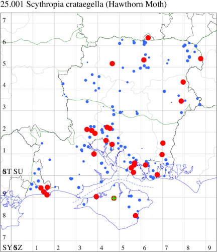 For the maps, all records prior to 2024 are shown by a blue dot (the larger the dot, the more recent), with the current year's records shown in red. As previous records are superimposed on any report for 2024, new sites have greater emphasis (i.e. will show as 'more red').