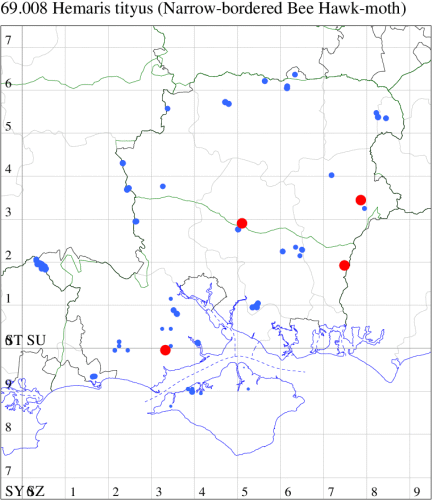 Nationally scarce (Nb) along woodland margins and on heathland in England and Wales. In Hampshire and on the Isle of Wight, has recovered from a low level in the 1970s; the species is reported occasionally, with the main population occurring in the New Forest. Wingspan 46-52 mm. The most likely confusion species is Narrow-bordered Bee Hawk H. tityus, which see for differences. Larva feeds on Honeysuckle, over-wintering as a pupa.