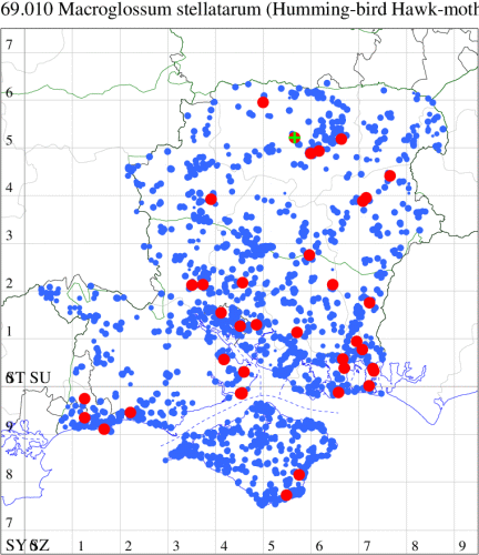 Common immigrant from southern Europe, appearing throughout the British Isles, in some years arriving in sufficient numbers to breed. In Hampshire and on the Isle of Wight appears annually in varying numbers, and on average increasing year on year. Has been recorded in winter, and is known to hibernate, and therefore spring records likely refer to overwintering individuals rather than new immigrants. Wingspan 50-58 mm. An unmistakable diurnal moth, which hovers to nectar from the flowers of many plant species, amongst which are Aubrieta, Buddleia, Viper's Bugloss Echium vulgare, Red Valerian Centranthus ruber, Honeysuckle Lonicera, Nepeta, Petunia, Jasminum and Pulmonaria. Larva feeds on Lady's Bedstraw, Hedge Bedstraw and Wild Madder.