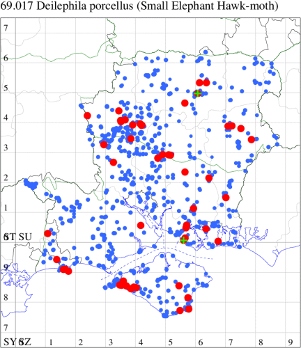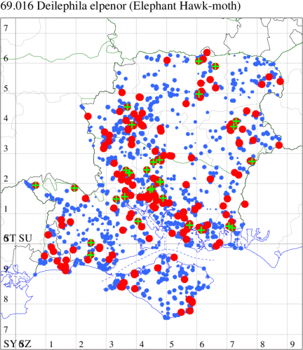 Common in hedgerows, gardens, woodland edges and heathland, and on rough grassland and sand-dunes throughout England, Wales and southern Scotland. Widely distributed and occasionally abundant throughout Hampshire and on the Isle of Wight. Wingspan 62-72 mm. Small Elephant Hawk-moth D. porcellus is superficially similar, but smaller, with forewing yellow and pink, not olive-green and pink. Larva feeds on Rosebay Willowherb, Great Willowherb, Lady's Bedstraw, Hedge Bedstraw, Heath Bedstraw and Marsh Bedstraw, over-wintering as a pupa.