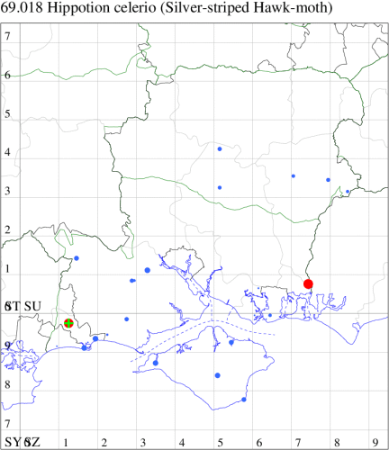 Rare immigrant from mainland Europe, appearing throughout England and, occasionally, southern Scotland. Absent in many years, but numbers have exceeded ten in several years: 1865, 1868, 1885 (when 41 were recorded) and 1963. In Hampshire and on the Isle of Wight singletons have appeared in ten of the last fifty years, with two in 1978. Wingspan 72-80 mm. Fairly unmistakable. Larva feeds on Lady's Bedstraw, Great Willowherb and Honeysuckle, no evidence of breeding in the UK.