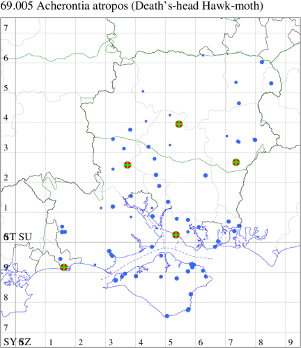 Rare immigrant from southern Europe, appearing in southern and eastern England, in some years arriving in sufficient numbers to breed in very small numbers. In Hampshire and on the Isle of Wight much less common than Convolvulus Hawk-moth, although the larvae are reported more often. Wingspan 102-135 mm. Unmistakable. Larva feeds on Deadly Nightshade, Woody Nightshade and Potato, causing sufficient damage to be a serious pest in some areas, unable to over-winter in significant numbers.