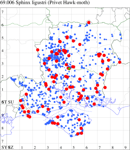 Common on downland and open woodland, and in hedgerows, gardens and fens throughout southern England. Widespread and common in Hampshire and on the Isle of Wight. Wingspan 100-120 mm. Unmistakable. Larva feeds on Wild and Garden Privet, Ash, Lilac and Guelder-rose, over-wintering as a pupa.