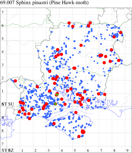 Local in coniferous woodland, plantations, heathland and gardens throughout much of south-eastern England. In Hampshire and on the Isle of Wight a species which has spread rapidly since the middle of the 20th Century, but has declined since, although still widespread but never common wherever there are pine trees. Wingspan 72-80 mm. Unmistakable, there are three or four black dashes in disc, and the forewing fringe is chequered. Larva feeds mainly on Scots Pine and Norway Spruce, but also on Maritime Pine and Cedar-of-Lebanon, over-wintering as a pupa.
