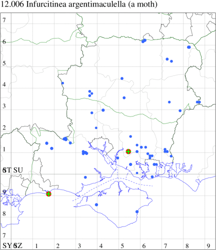 For the maps, all records prior to 2024 are shown by a blue dot (the larger the dot, the more recent), with the current year's records shown in red. As previous records are superimposed on any report for 2024, new sites have greater emphasis (i.e. will show as 'more red').
