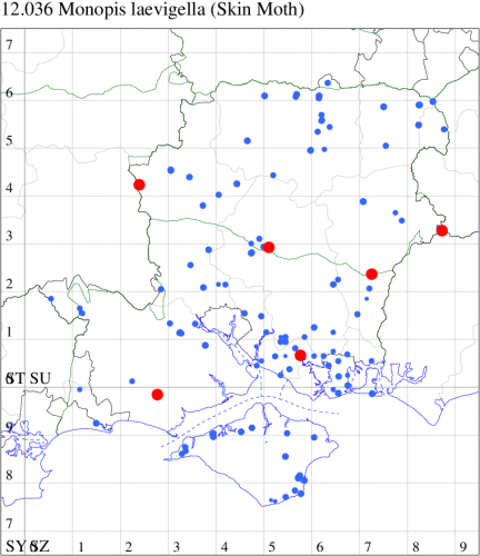 Common in a wide range of habitats throughout Britain, more numerous in the north. Scattered records from Hampshire and the Isle of Wight. Wingspan 13-18 mm. Very similar to Skin Moth M. laevigella, and some of the criteria quoted for the separation of the two species are of limited use when confronted with a single specimen in isolation. Larva feeds on dead animals and animal waste, often in bird nests.