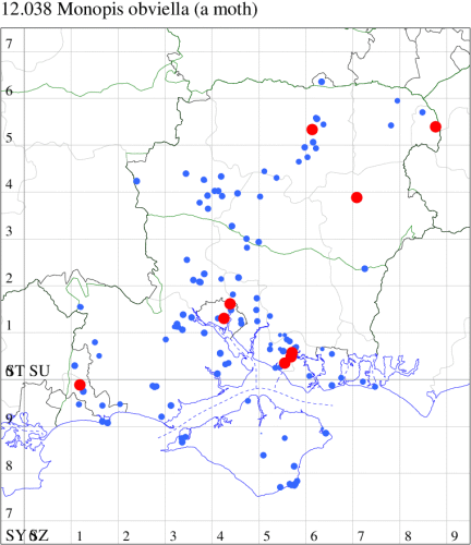 VC11: Romsey, one, 08 Aug; one, 17 Aug (NRJ); Allbrook, one, 26 May (SIng); Botley Wood, one, gen. det, 05 Aug (AMD); Funtley, three, 09 May; one, 11 May; one, 15 May; one, 18 May; one, 26 May; one, 07 Jun; one, 01 Aug; one, 02 Aug; one, 12 Aug; one, 09 Oct (TDC); Dean, Bishop's Waltham, present, 12 Aug (CMor); Wickham, two, 02 Aug (JRDS); Hengistbury Head NNR, one, 11 Aug (MoTay det. MJef);