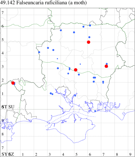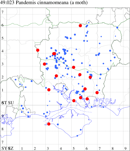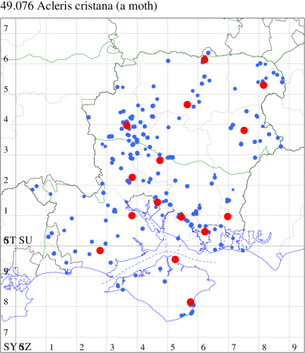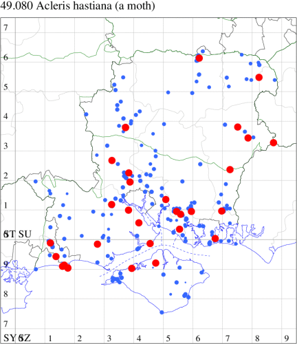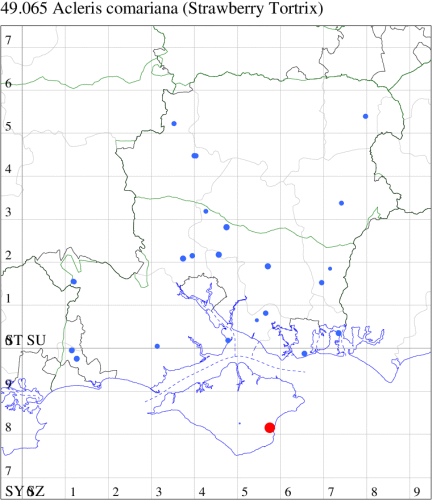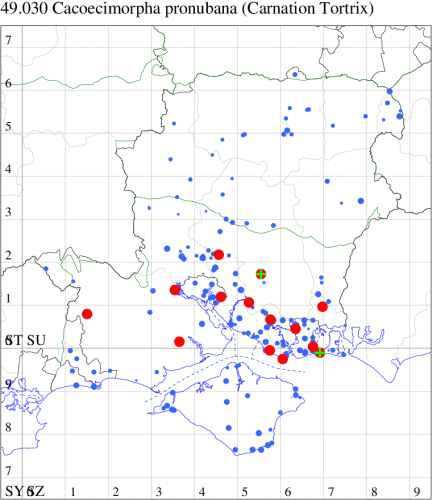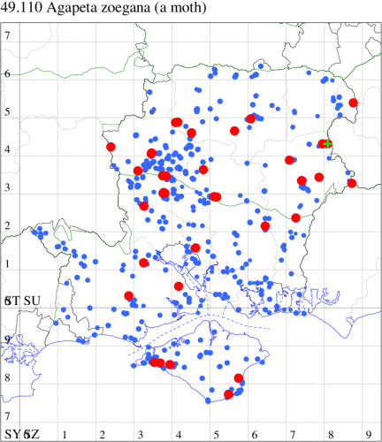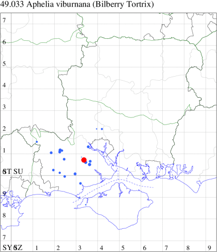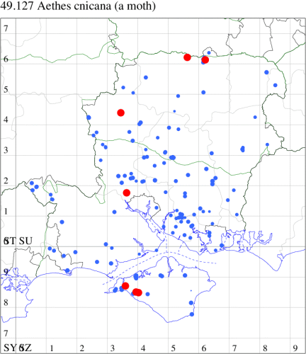 VC11: Earliest: Lee, 09 Apr, 1 (CTha) Latest: Burton, nr Christchurch, 15 Sep, 1 (JStw) Max count: Hengistbury Head NNR, 09 Aug, 5 (BKin)
