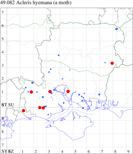 Common in woodland and gardens throughout the British Isles. In Hampshire and on the Isle of Wight widespread and fairly common in woodland throughout. Wingspan male 15-21 mm, female 16-24 mm. Most similar to A. crataegana, but differing in the more variegated appearance and smaller size [Bradley]. Larva feeds on various deciduous trees and bushes, including Oak, Elm, Lime, Hazel, Field Maple, Sycamore and Ash, living within a spun or rolled leaf, and over-wintering as an egg.
