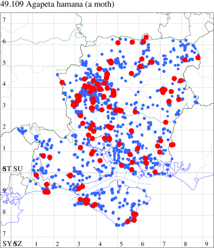 VC11: Marchwood, one, 11 Aug; one, 28 Aug (CTha); Romsey, one, 23 Jun (NRJ); Dibden Purlieu, one, 11 Aug (RAC); West End, two, 01 Sep (AMD); Brownwich Cliffs, Titchfield, one, 16 Aug (F.M.G.); Stubbington, one, 11 Aug (DPH); Funtley, one, 22 Jun; two, 25 Jun (TDC); Lee-on-Solent, two, 23 Jun; two, 25 Jun; one, 26 Jun; two, 30 Jun; two, 01 Jul; one, 02 Jul; one, 01 Sep; one, 07 Sep (IHrg); Fareham, one, 16 Aug (ADT); one, 12 Aug; one, 14 Aug; one, 17 Aug; one, 02 Sep (MLO); Botley, one, 11 Aug; one, 08 Aug; one, 09 Aug (SLB); Portchester, one, 27 Aug (CEH, JGS); one, 09 Aug; two, 11 Aug; one, 18 Aug (DH-J); Horsea Island, one, 07 Jun (F.M.G.); Portsmouth, one, 31 May; one, 03 Jun; two, 17 Jun; one, 25 Jun; one, 11 Jul; one, 16 Jul; 14, 09 Aug; eight, 10 Aug; six, 11 Aug; one, 26 Aug; three, 31 Aug; two, 01 Sep (IRT); Waterlooville, two, 02 Jun; one, 04 Jun; one, 21 Jun; two, 23 Jun; one, 07 Aug; one, 09 Aug; two, 11 Aug; three, 13 Aug; six, 15 Aug; three, 17 Aug; four, 19 Aug; seven, 22 Aug; three, 24 Aug; five, 26 Aug; two, 27 Aug; one, 29 Aug (DWhe); West Walk, one, 23 Aug (F.M.G.); Southleigh Forest, one, 22 Aug (CGree det. TJon); Hurn, one, 02 Sep (MJef); Christchurch: Cross Way, one, 26 Aug (LPyk); Sway, one, 12 Aug; one, 13 Aug (SKee); Sway, NF, present, 01 Sep (DMui);