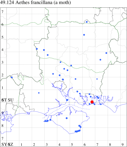 Nationally scarce (Nb) on downland and waste ground in southern England, with records north to Lancashire and Yorkshire. In Hampshire scattered records on the chalk from Cholderton and Martin in the west to Selborne and Oxenbourne Down in the east, and on the chalk north of Portsmouth. On the Isle of Wight, there have been a few records in recent years. Wingspan 12-15 mm. Distinguished from A. francillana and A. beatricella by having the median fascia of the forewing obsolescent in the costal half [Bradley]. Larva feeds on seeds of Wild Parsnip and Hogweed, living between seeds spun together with silk.